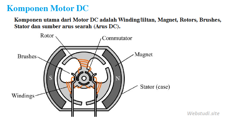 Komponen utama dari Motor DC adalah Winding/liltan, Magnet, Rotors, Brushes, Stator dan sumber arus searah (Arus DC). Ketika armature ditempatkan dalam medan magnet yang dihasilkan oleh magnet maka armature diputar dengan menggunakan arus searah, hal ini menghasilkan gaya mekanik. Dengan memanfaatkan putaran motor DC banyak jenis pekerjaan yang dapat dikerjakan.
